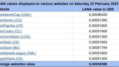 Izbrano • Kriptonovice • Nekategorizirano • Novice LANA – LANAcoin – Prices of LANA on Exchanges on Sunday 18 May 2025 18:44 UTC+2, PLAN15 Day 972 18. maja, 2025